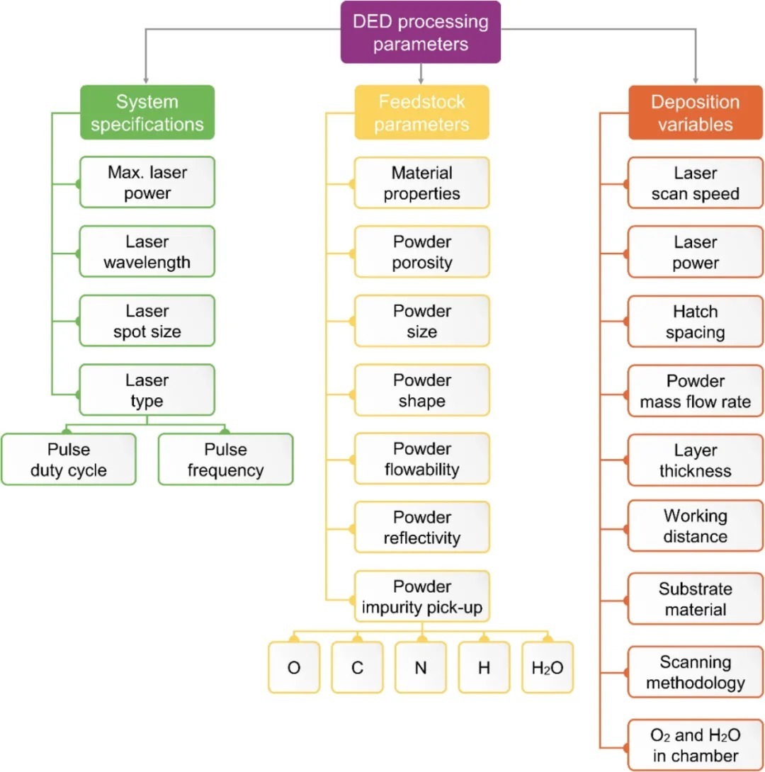 DED过程使用激光、电子束或等离子体/电弧形式的聚焦热源。因此,用DED工艺制备的样品经历了重复的热循环和非常高的熔池冷却速度(激光熔化103-105 K/s),在凝固时,会产生细小的、不平衡的显微组织和高残余应力,在某些情况下还会出现开裂。对于吹粉DED过程,影响沉积材料的过程参数分为三个主要分支:(1)系统(规格)相关,(2)原料(在这个例子中是粉末)相关,(3)过程(沉积)变量相关。这些如图7所示。图7中所列的复杂的热历史和大量的工艺参数使得很难完全表征和研究每个参数对沉积材料的影响(以及它们的交联作用)。