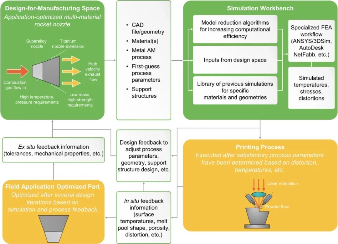 值得注意的是,与焊接工艺相似,DED工艺高度依赖于粉末原料材料的不同性质,包括化学成分、熔化温度、导热系数、反射率、比热容、熔体粘度、熔体表面张力、光谱发射率等。材料性能对沉积过程的高度依赖导致需要对特定材料的工艺进行优化。近年来,各种数值模拟和现场监测技术伴随着闭环自适应控制被提出来解决这一挑战,预测、关联和控制给定材料的最佳工艺参数。图8所示为组合梯度火箭喷管加工的原理图工作流仿真示例。这种模型可以通过模拟热、凝固、显微组织和性能数值模拟来模拟沉积过程,从而基于预先定义的几何形状和材料属性来确定最佳工艺参数。基于模拟的最优工艺参数,结合现场监测技术和闭环反馈控制,按照预先设定的刀具路径执行沉积过程。