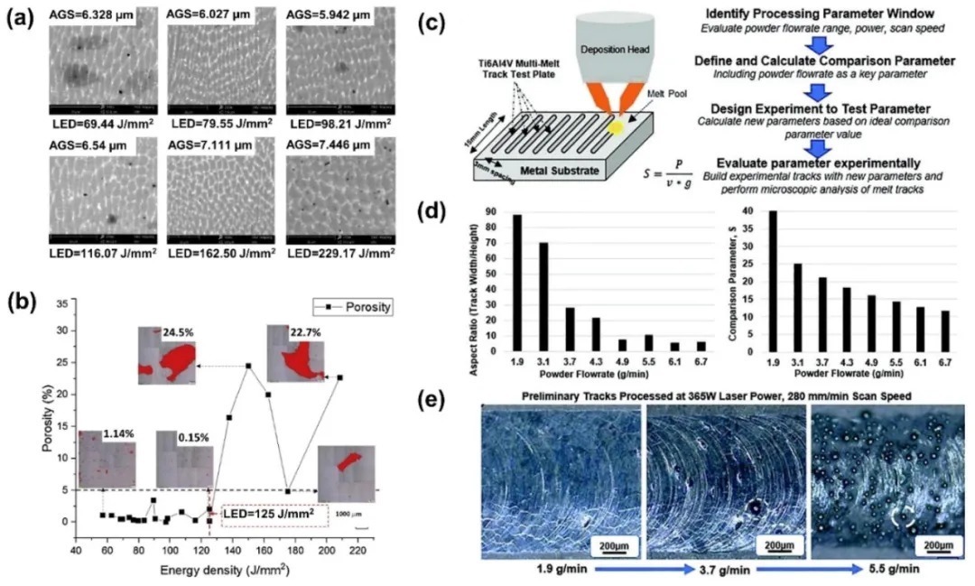 图9 (a)激光能量密度对晶粒形貌和平均晶粒尺寸(AGS)的影响,(b)沉积态Inconel 718的孔隙率 (c)使用LENS?进行DED加工设计的原理图和工作流程。(d)不同粉末流速下的初始沉积轨迹,(e)不同流速下的沉积特征。
