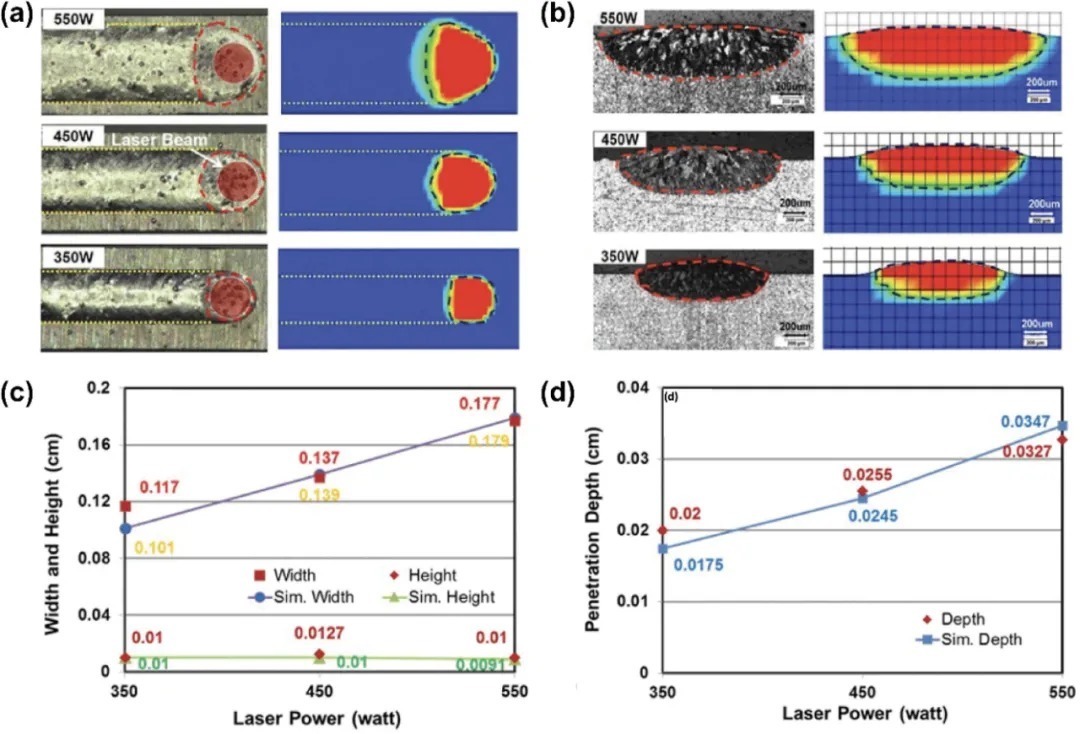 图10 不同激光功率下实验与模拟单轨镀层的俯视图(a)和侧视图(b)。激光功率对Inconel 718镀层几何形状(c)和穿透深度(d)的影响。